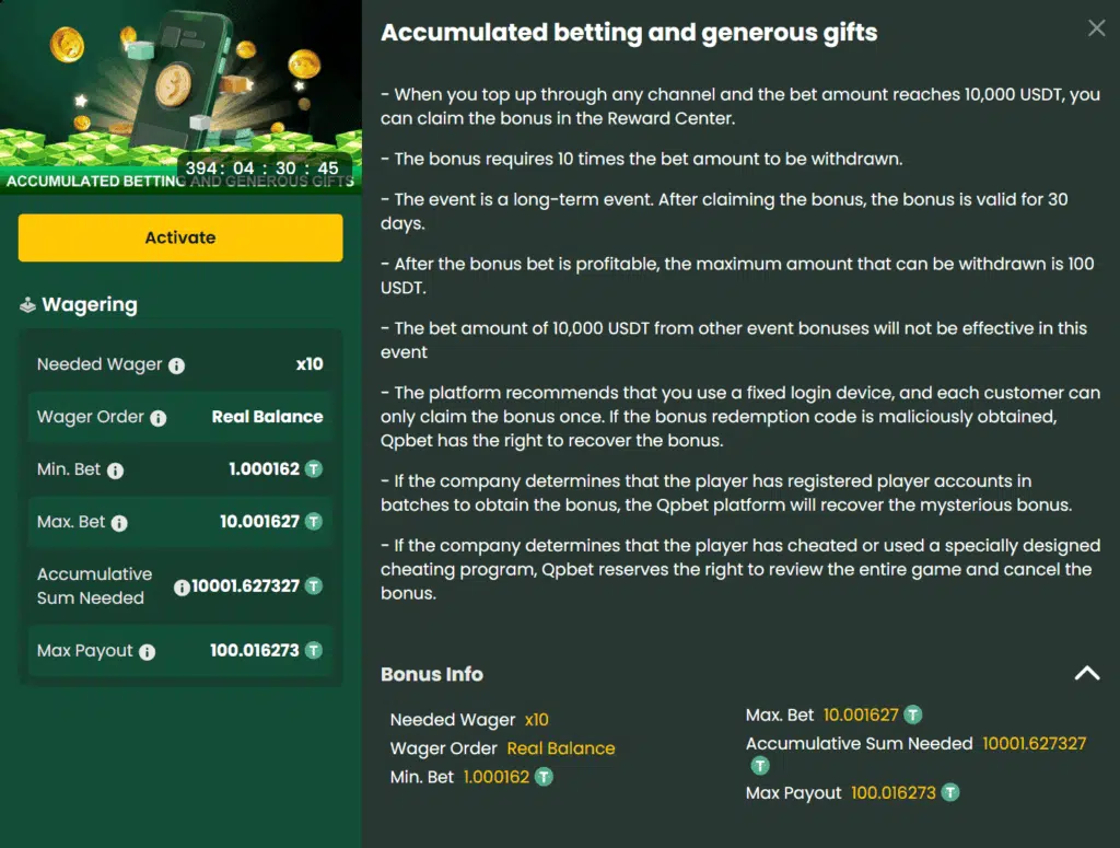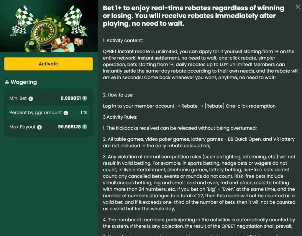 In order to thank every player for participating, QPBET has established a systematic reward mechanism, including novice gift packages, recharge rewards, continuous rebates, event bonuses and loyalty programs. When new users register and recharge for the first time, they can get a 100% first deposit doubling bonus, which will help you double your starting capital and explore more game content. Regardless of the recharge amount, you can get corresponding rewards to maximize the efficiency of fund utilization.